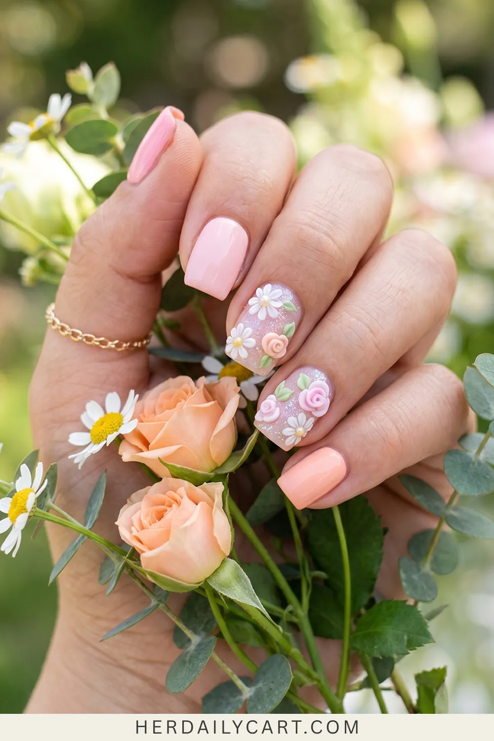 This charming 3D floral accent nail design blends soft pink and peach tones with delicate floral details that instantly brighten the overall look. The mix of tiny daisies and sculpted roses adds a playful, garden-inspired touch, while the subtle shimmer base gives the manicure a light, glowing finish.