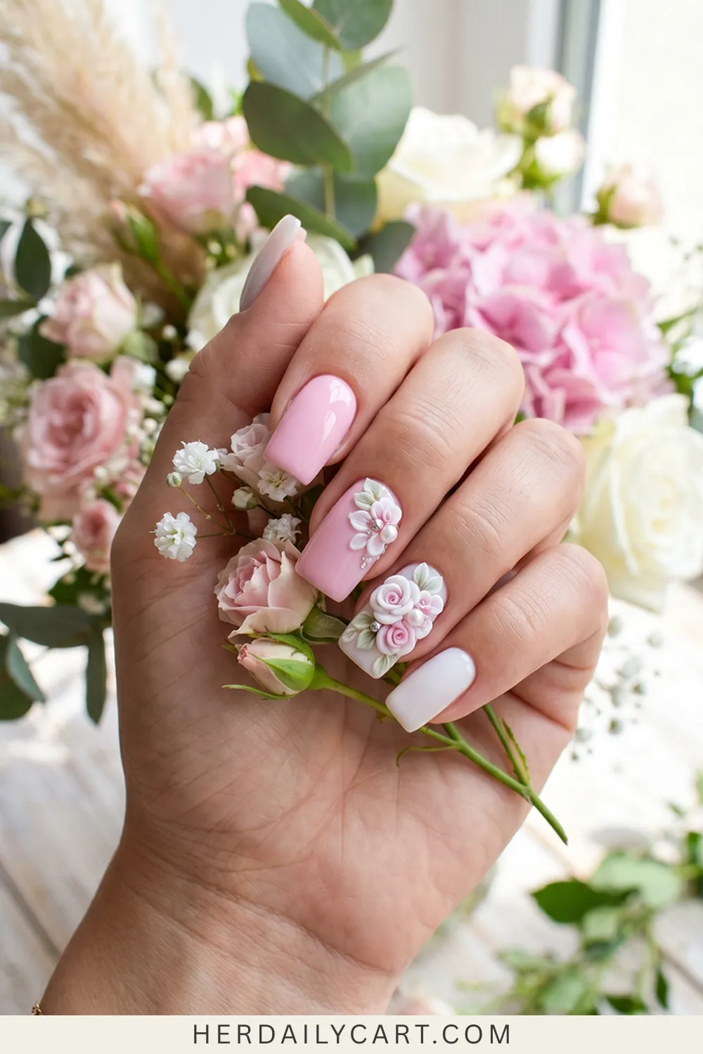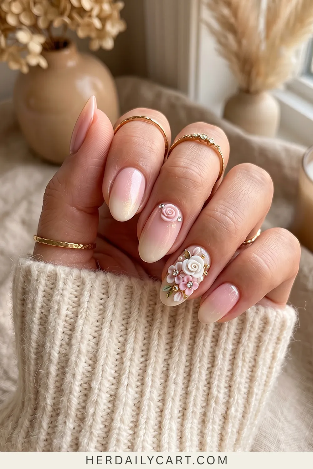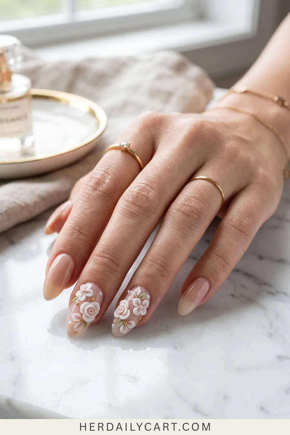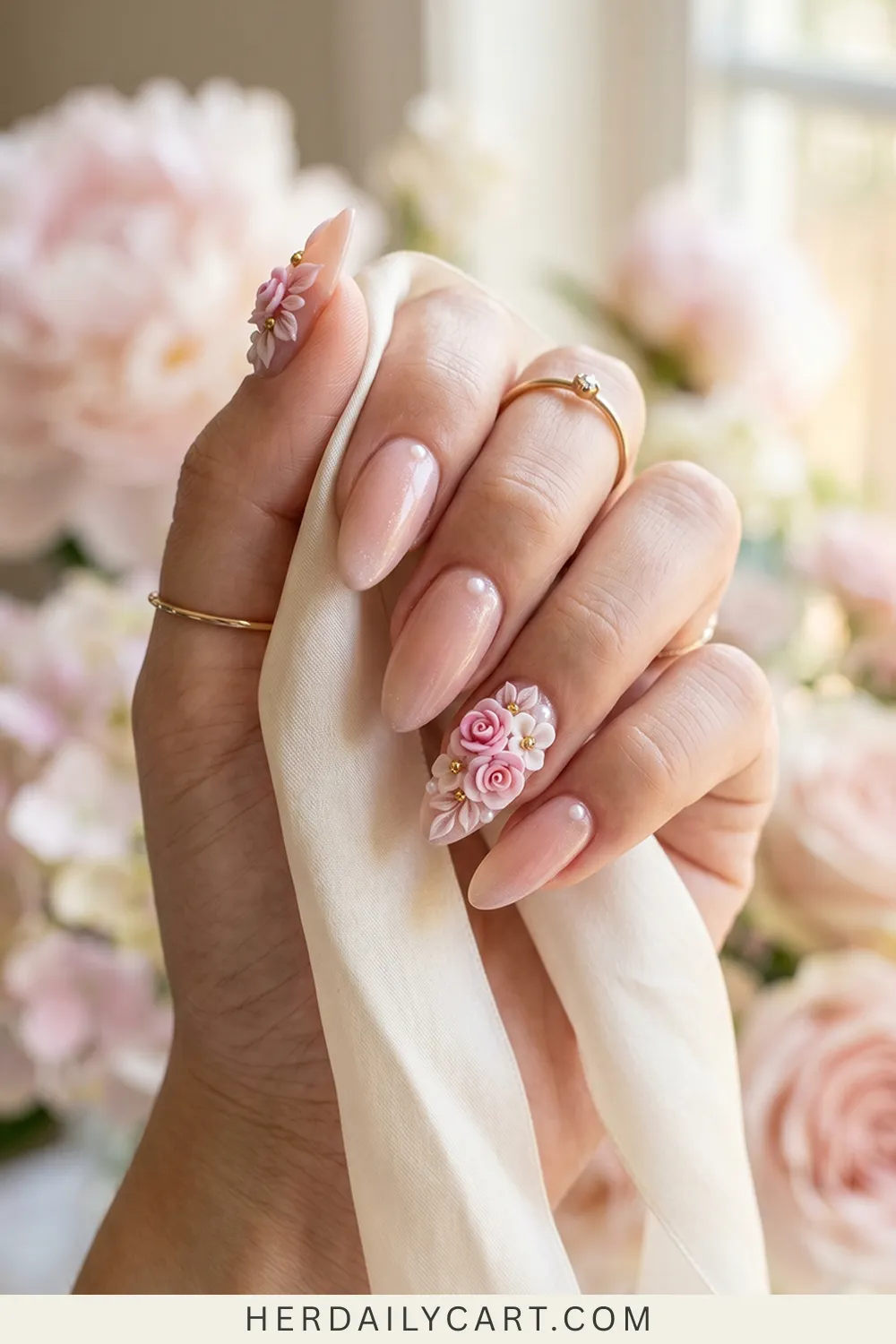 1. 3D Floral Accent Nails for a Soft Romantic Look