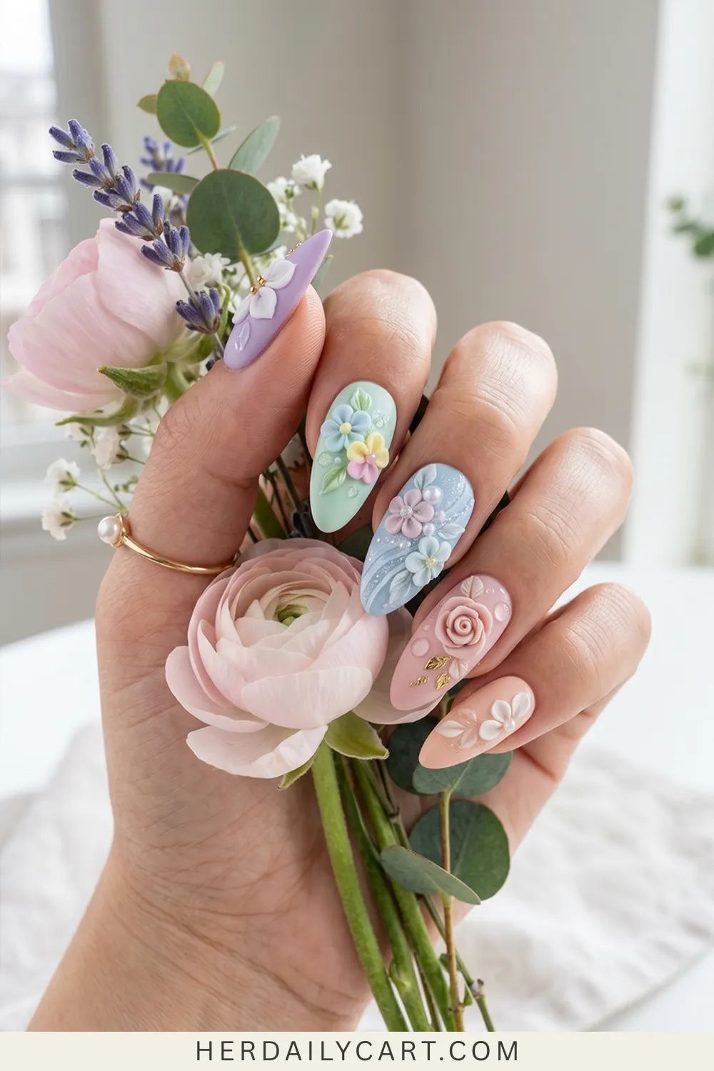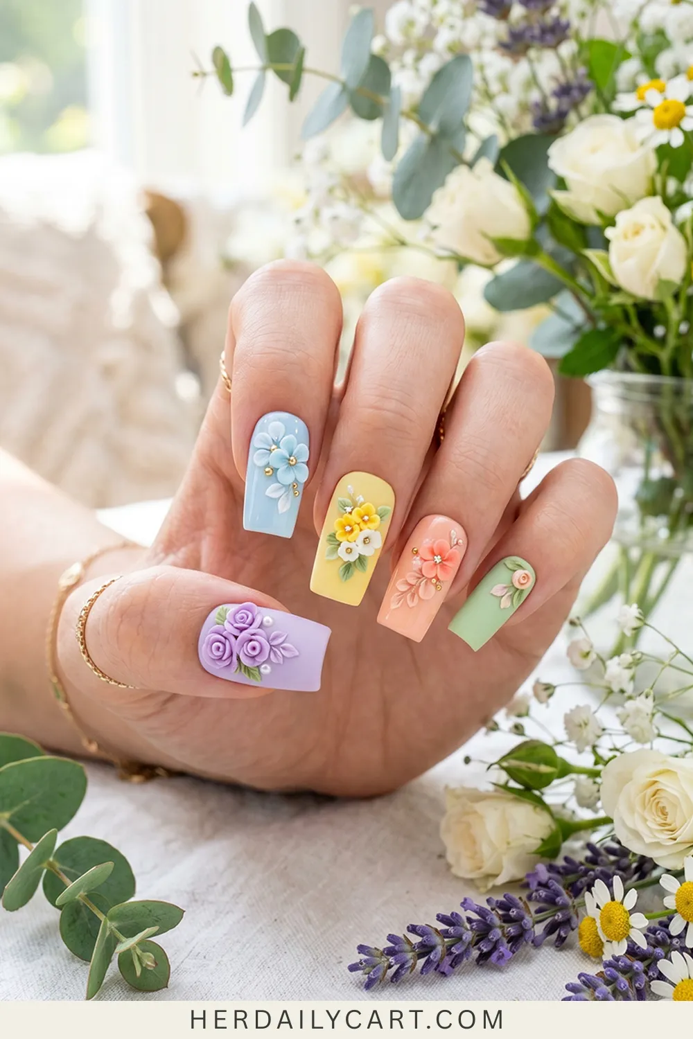 This Pinterest-worthy 3D floral nail design showcases a beautiful mix of pastel tones, where each nail features its own unique color and floral composition. From soft lavender to mint green and baby blue, the palette feels fresh, airy, and perfectly balanced.
