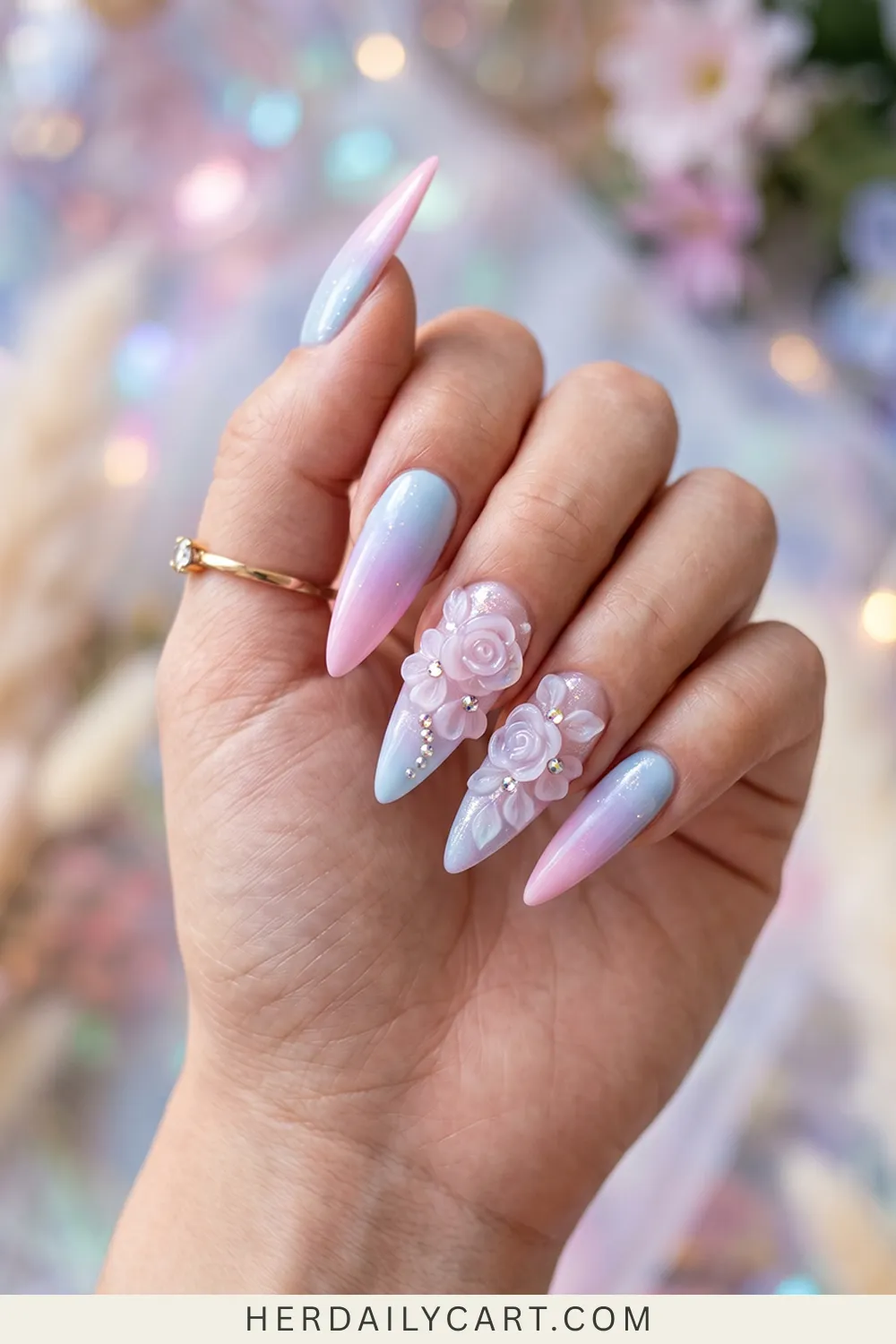 This dreamy 3D floral nail design features a soft pastel ombre blending pink and baby blue tones, creating a smooth, airy finish with a light, glowing effect. The translucent floral accents add delicate dimension, while rhinestone details bring a subtle sparkle that enhances the overall ethereal look.