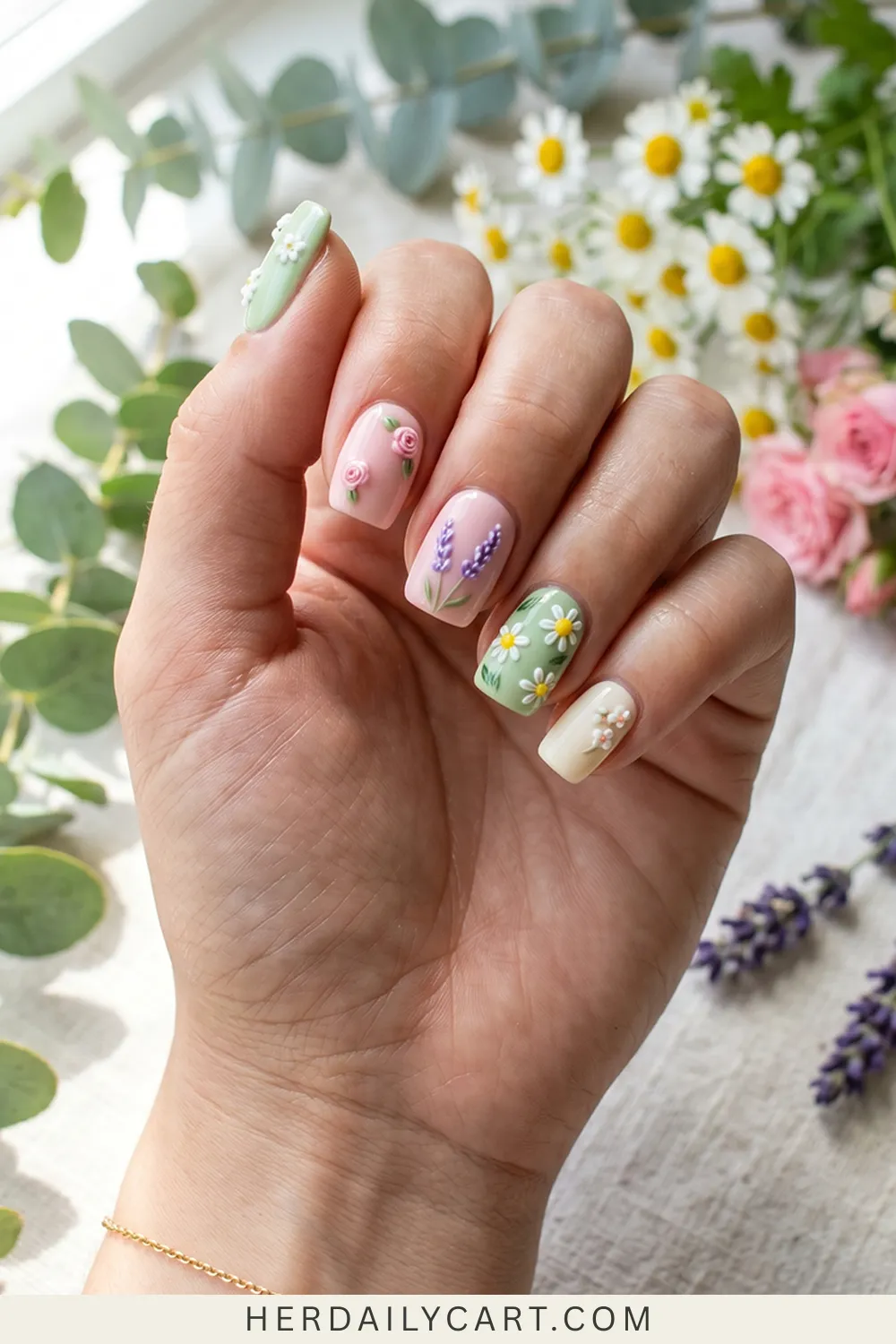 This fresh floral nail design features a soft blend of green, blush pink, and airy neutrals, creating a light and nature-inspired look that feels instantly refreshing. Each nail showcases unique 3D floral details—from tiny daisies to delicate roses and lavender accents—adding variety and a playful, artistic touch.