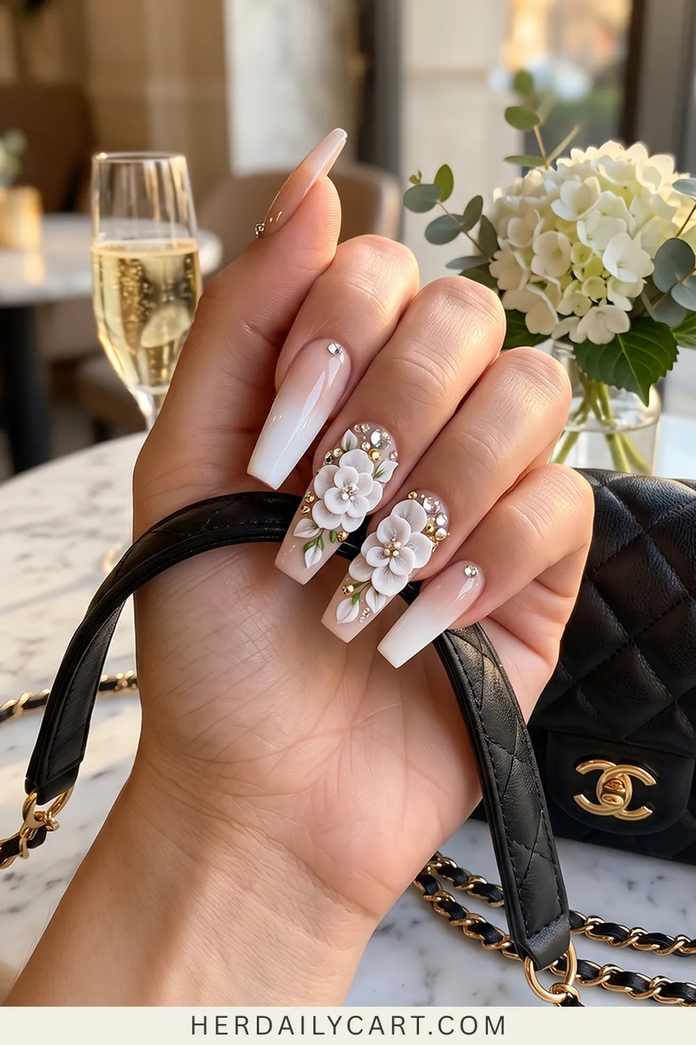This lovely 3D flower nail art design combines a soft nude base with a seamless white ombre, creating a sleek and polished foundation. The bold sculpted floral accents, enhanced with rhinestones and gold details, add depth and a statement-worthy finish that instantly elevates the look.