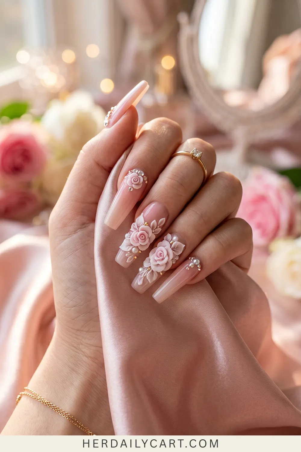 This romantic 3D flower nail design features a soft blush pink base that creates a warm, glowing foundation with a delicate, feminine feel. The layered sculpted roses add rich dimension, while pearl accents and subtle gold details bring a refined soft glam finish.