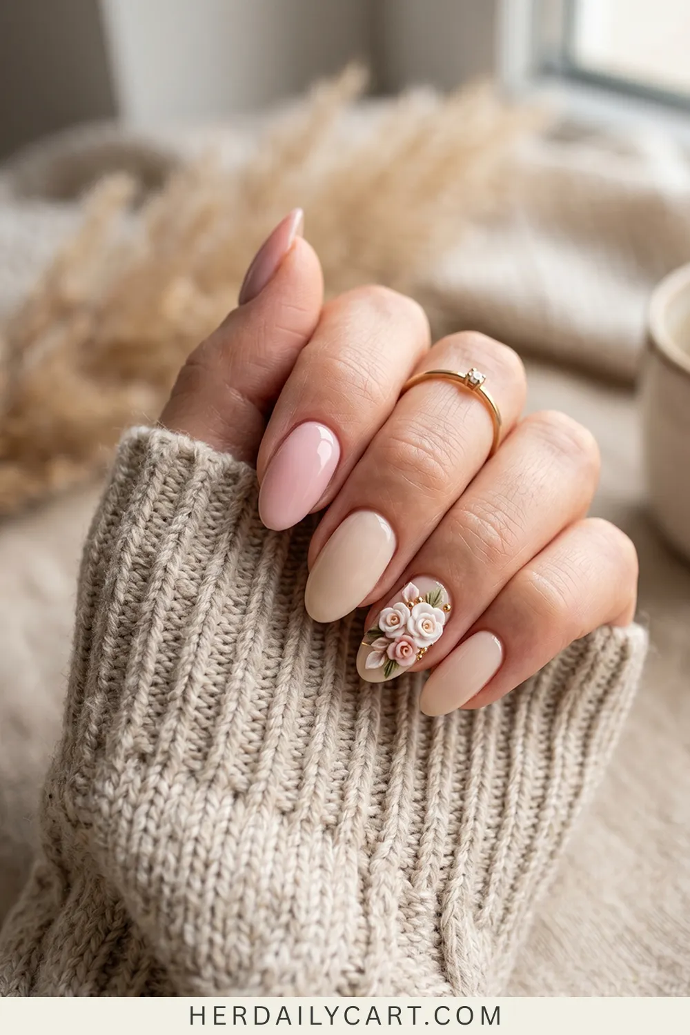 This soft feminine 3D floral nail design features a beautiful blend of blush pink and warm beige tones, creating a calm and cozy neutral palette. The manicure keeps most nails clean and glossy, allowing the accent nail to stand out with a delicate cluster of sculpted roses.